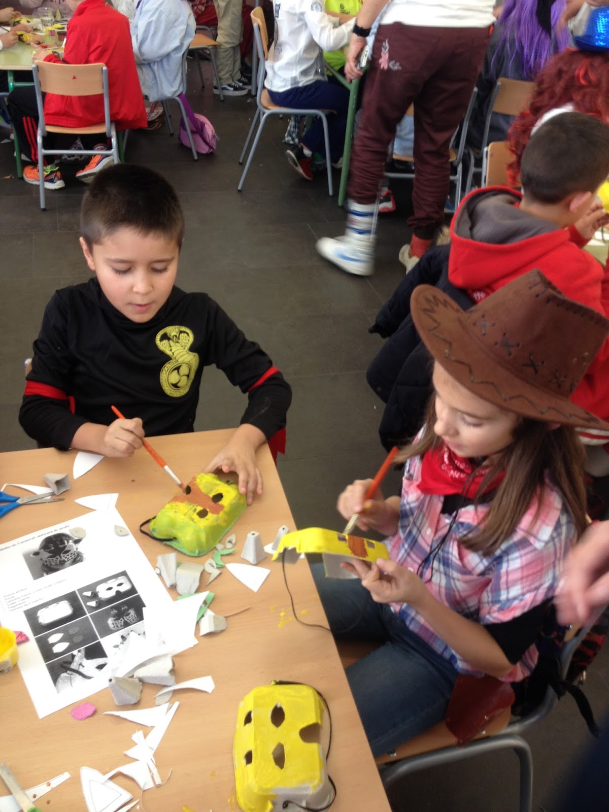 Cuando toda la comunidad educativa trabaja unida pasan grandes cosas... El pasado viernes, numerosos padres y madres de la AMPA del CRA Villaquilambre pasarón la jornada lectiva en el colegio, para llevar a cabo un TALLER DE MÁSCARAS DE CARNAVAL en compañía del profesorado y del alumnado del CRA. Si a eso le añadimos la gran fiesta de disfraces y el chocolate durante el recreo para recuperar fuerzas, el resultado no podía ser otro que UNA GRAN JORNADA.